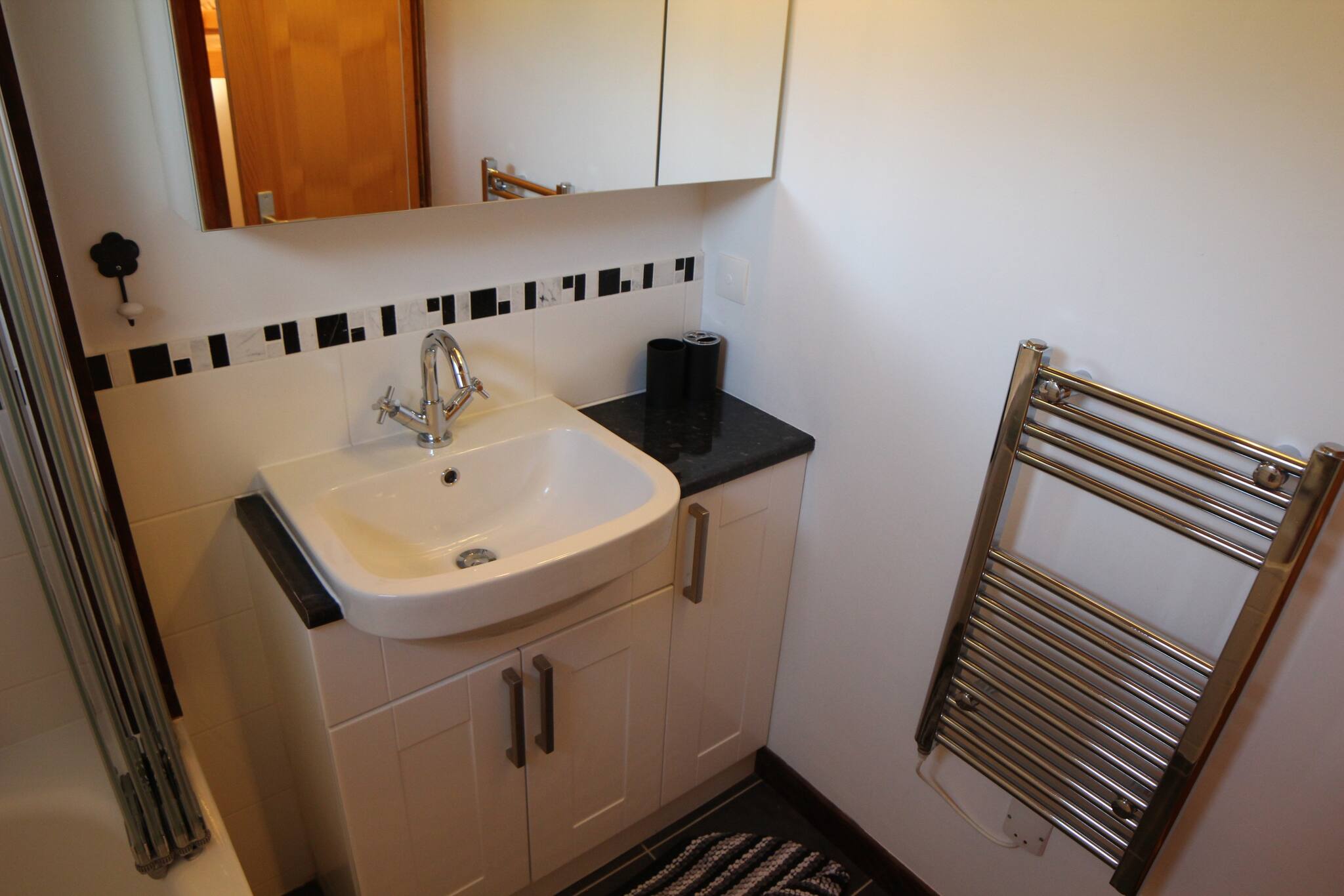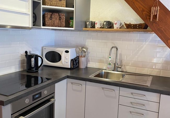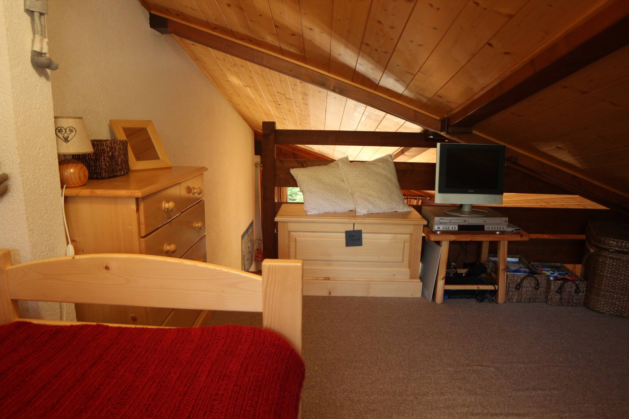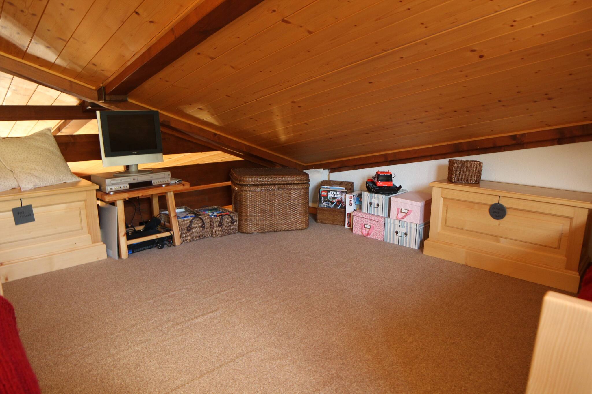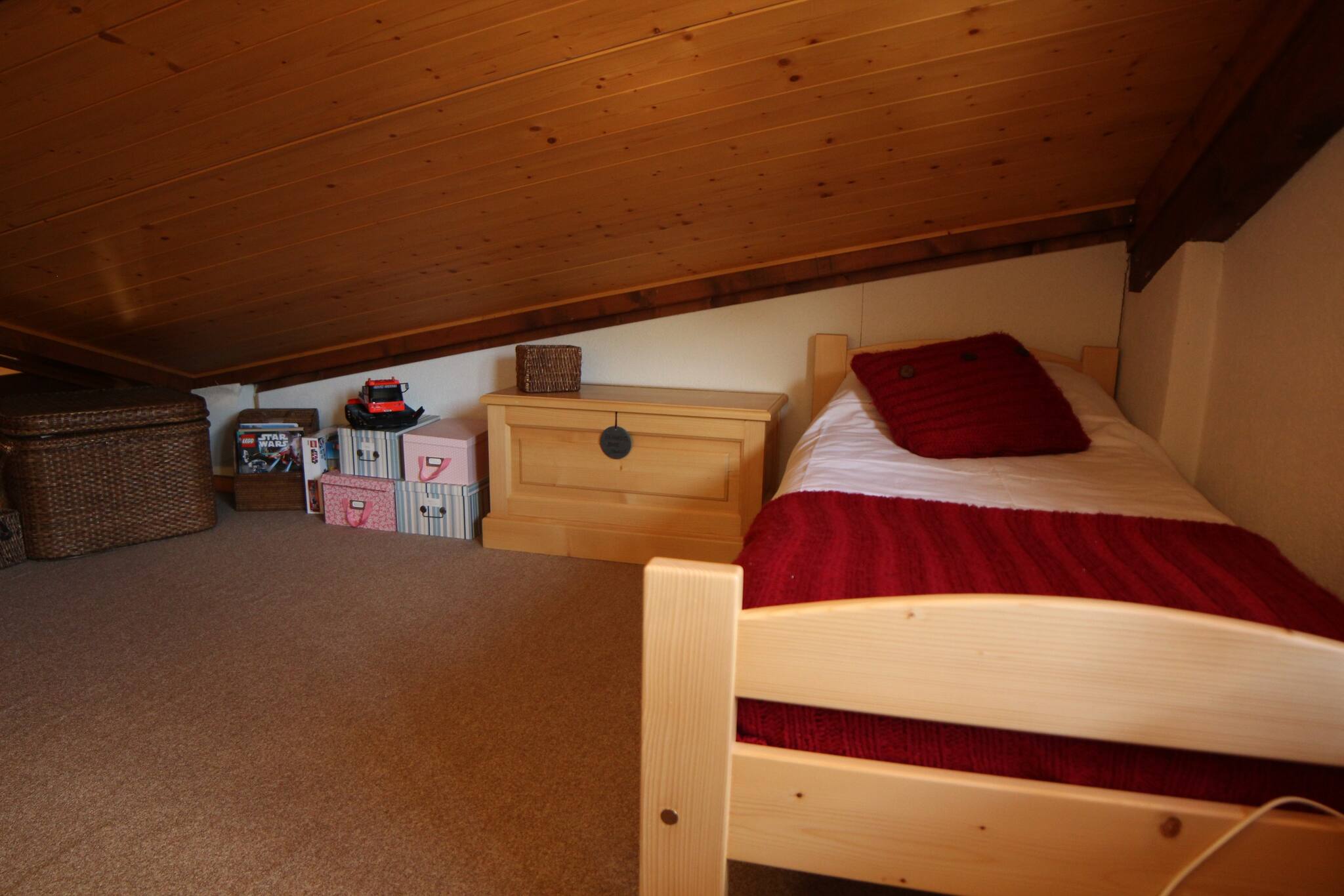 There is a cosy living area with a small kitchen. A double bedroom, two single beds on the mezzanine and bunks in the hallway.
